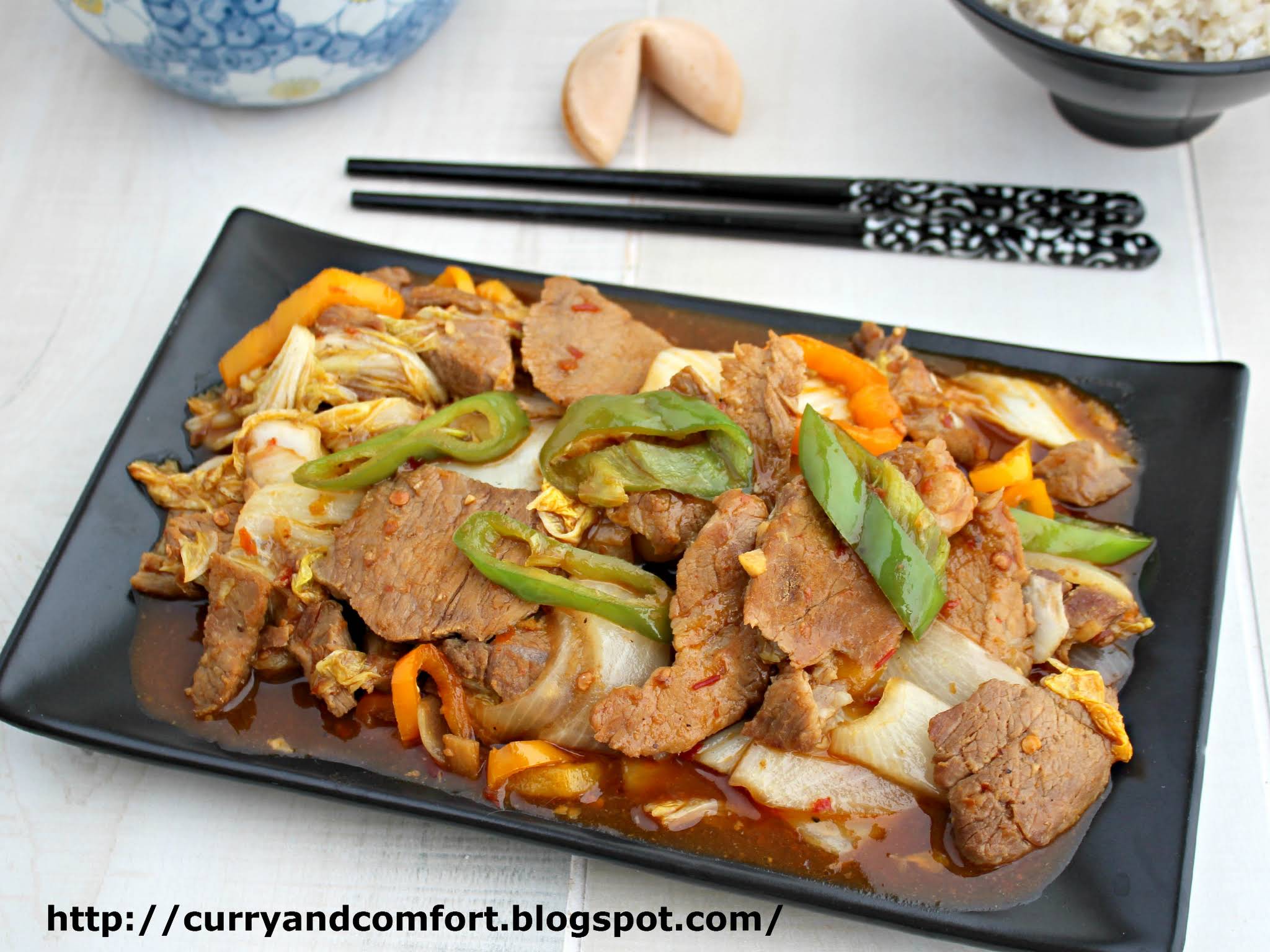 1 Place pork, sherry, ginger slice, and a single scallion cut in half in saucepan Fill with water until meat is barely covered Cover and simmer until meat is tender (about 45 minutes) 2 Remove meat from broth and refrigerate until cold Then cut into 1 and a half inch pieces 3 Combine garlic chili sauce, hoisin sauce, soy sauce, andThe bare bones of the recipe come down to basically five words fry whole, slice, fry slices First the whole fillet is seared in a pan on all sides for about four minutes You let it cool down which is when you can see wonderful opportunities of a dish prepared ahead and then slice it neatly Combine red chili (crumbled), hoisin sauce, soy and sugar Cut bell pepper into 1" squares, cut remaining 2 onions into 1" lengths Put wok on high, add 2 tablespoons oil, stir fry onions and peppers 1 1/2 minutes, add salt and stir;
